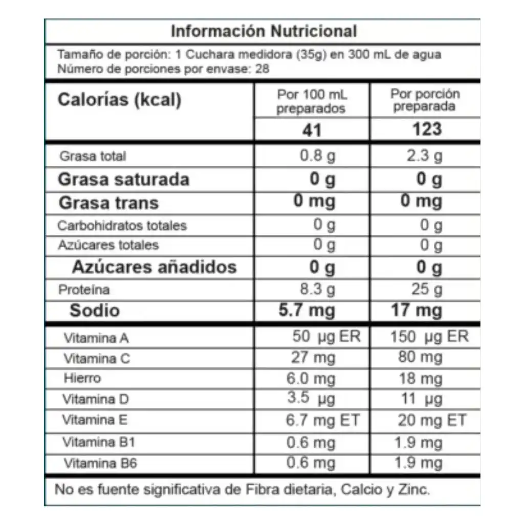 Ingredientes: Proteína de Arveja, Proteína de Arroz Orgánica, BCAA (L-Leucina, L-Isoleucina, L- Valina), Leche de Coco en polvo, Cocoa, Sabor idéntico al natural (Chocolate), Goma Xanthan (Espesante), edulcorante natural (Stevia), Vitamina C (Ácido Ascórbico), Citrato de Sodio, Fumarato ferroso, Vitamina E, Lactobacillus Paracasei (Cultivo probiótico), Vitamina B6(Piridoxina), Biotina, Vitamina B1 (Tiamina), Betacaroteno, Vitamina D3.
