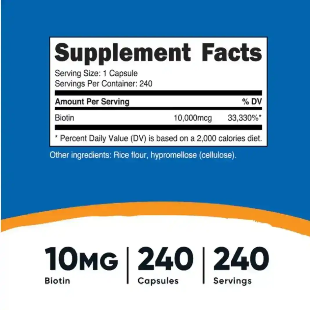 Nutricost Biotin é um suplemento de alta qualidade desenvolvido para apoiar a saúde do cabelo, pele e unhas.