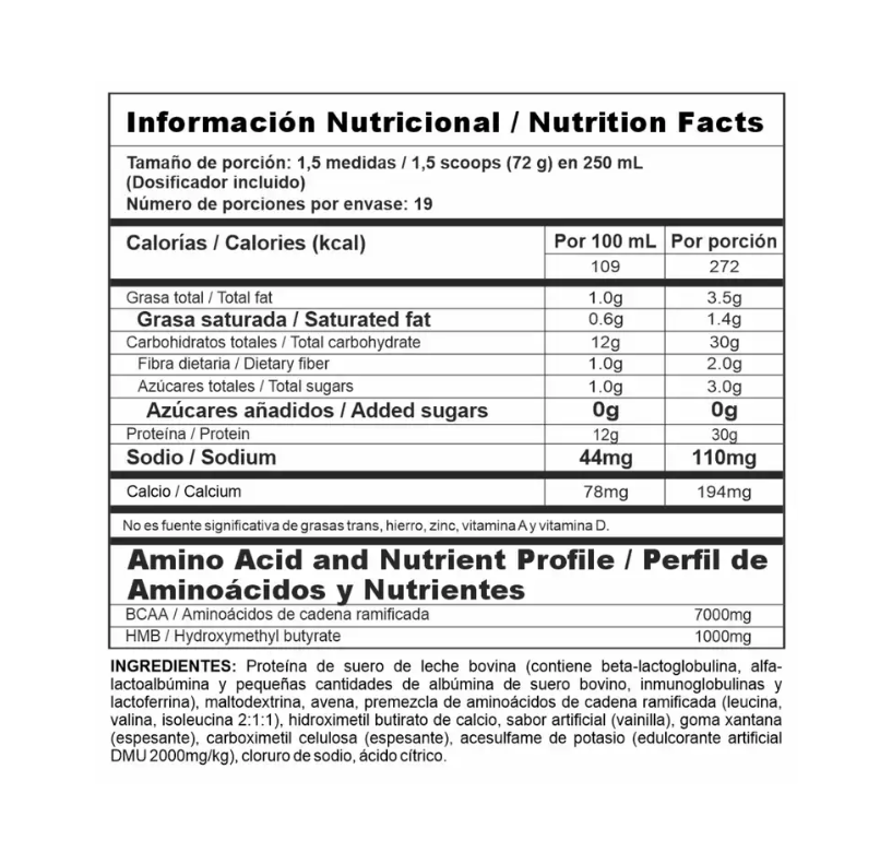 em até 9 parcelas. Solicite sua vagaDurante los entrenamientos de fuerza, las fibras musculares sufren daño, y al finalizar la actividad física, el cuerpo necesita recuperar la glucosa perdida (energía) porque es la principal fuente energética para el cerebro. También requiere una fuente proteica que suministre los aminoácidos necesarios para reparar y formar nuevas proteínas musculares. Bipro Mass proporciona la mejor proteína para construir masa muscular (whey protein) y una pequeña cantidad de carbohidratos para reponer la glucosa perdida y garantizar que la proteína no se convierta en energía. Además, contiene HMB, un ingrediente especial que activa la síntesis de proteínas y facilita el proceso de ganancia muscular.