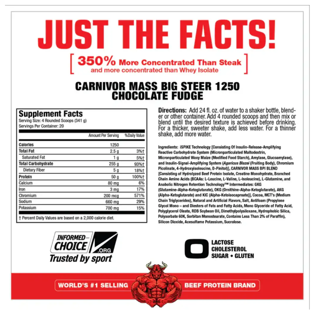 Carnivor Mass ofrece 50 gramos de proteína por porción, 255 gramos de carbohidratos, y un completo perfil de vitaminas, minerales, aminoácidos y creatina, diseñado para favorecer un rápido aumento de la masa muscular, mejorar la fuerza y facilitar la recuperación. Una característica distintiva de Carnivor Mass es la Tecnología iSpike™ exclusiva de MuscleMeds, que puede aumentar la insulina natural del cuerpo para optimizar la absorción de proteínas directamente en los músculos y reducir el almacenamiento de grasa.