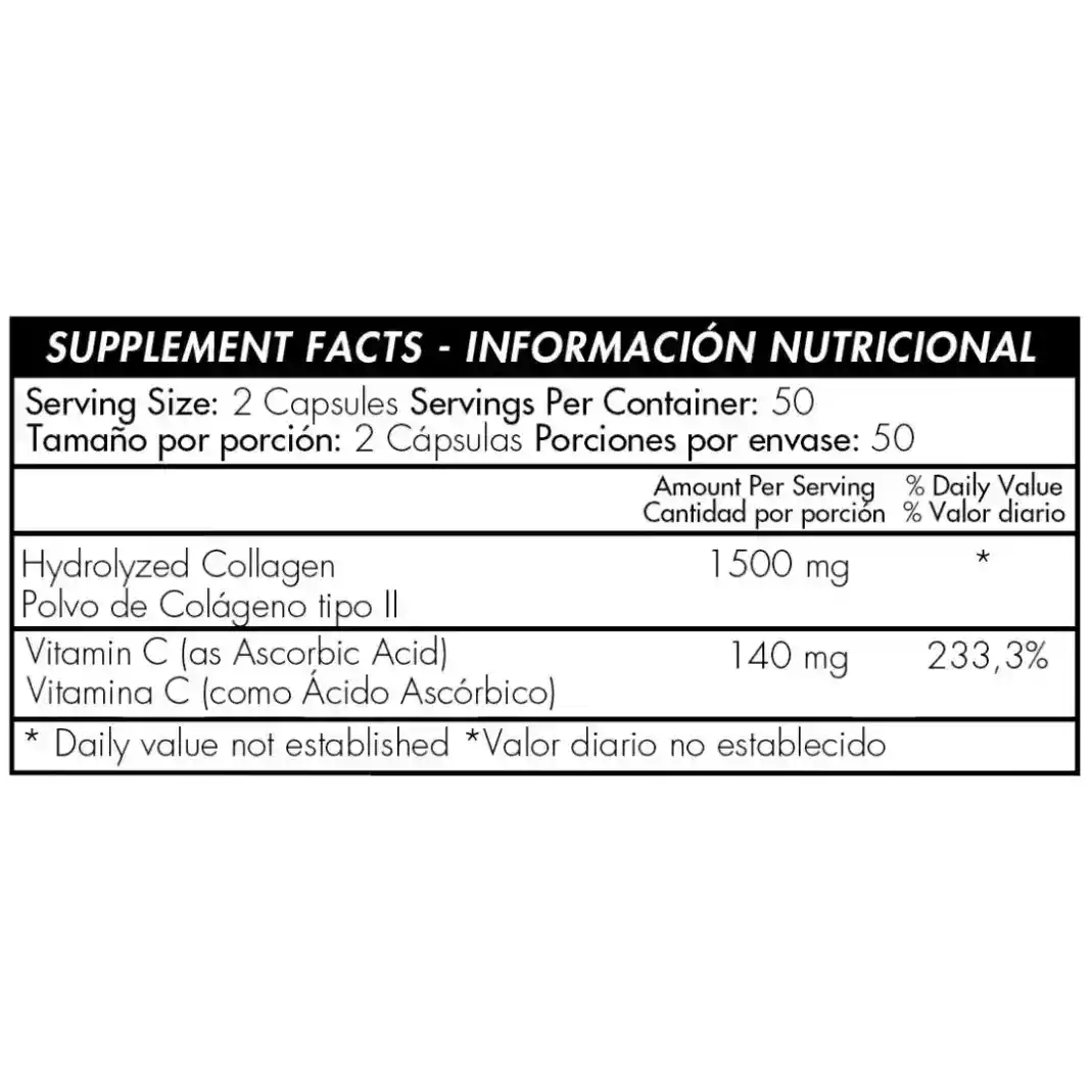 Colágeno em pó tipo II (frango) (origem aviária), Vitamina C (ácido ascórbico) (vegetal).
