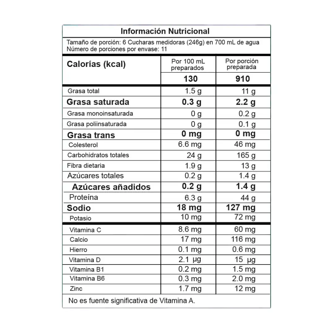 INGREDIENTES: Farinha de Aveia, Palatinose, Amilopectina, Proteína Whey, Caseinada de Leite, Sabor Idêntico ao Natural, Carboximetilcelulose CMC (Estabilizante), Lecitina de Soja (Estabilizante), Goma Xantana (Espessante), Adoçante Natural (Stevia), Dióxido de Silício (Anticompactante) (1000 mg/kg), Ômega 3, Vitamina C (Ácido Ascórbico), Lactase em pó, Citrato de Zinco, Vitamina B6 (piridoxina), vitamina B1 (tiamina), vitamina D3.