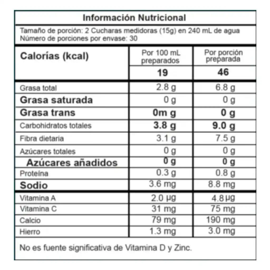 Polvo Deshidratado De Frutos Amarillos, Fibra De Manzana, Espinaca en Polvo, Acelga en Polvo, Te Verde, Alfalfa en Polvo, Espirulina, Brócoli en Polvo, Ácido Cítrico(Acidulante), Papaína En Polvo, Carboximetilcelulosa (CMC), Coliflor En Polvo, Kale En Polvo, Apio Molido, Pepino Cohombro, Saborizante Idéntico Al Natural (Lemon), Harina De Habichuela, Alcachofa En Polvo, Jengibre, Cúrcuma, Endulzante Artificial (Sucralosa), Cloruro De Calcio, Antioxidante (Ácido Ascórbico), Polen En Polvo, Cloruro De Sodio, Óxido De Magnesio, DióxidoDe Silicio, Lactobacillus Acidophilus, Colorante Natural (Clorofila), Lactobacillus Bulgaricus, Lactobacillus Gasseri.