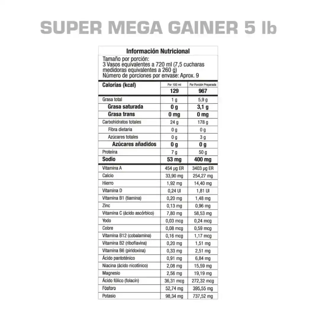Maltodextrina (estabilizante), proteína concentrada de suero, proteína aislada de soya, grasa de palma, avena, extracto de malta, premix de vitaminas: (vitamina A, vitamina B1, vitamina B2, vitamina B6, vitamina C, vitamina B3, vitamina B5, vitamina B12, vitamina B9, fósforo, calcio, potasio), glutamina, aminoácidos (leucina, isoleucina, valina), sabor artificial a vainilla gourmet, suero de leche, endulzante artificial (sucralosa (E955), acesulfame K (E950), aspartame (E951), fosfato tricálcico (anticompactante), cloruro de sodio (acentuador de sabor).
